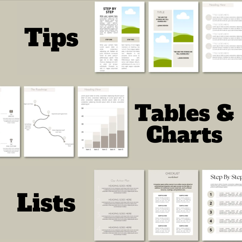 250 Fully Editable Pages: Easily customize every page to suit your brand and content needs. With a variety of layouts, including cover pages, content sections, chapter layouts, and more, you’ll have everything you need to build a professional-looking eBook or workbook.